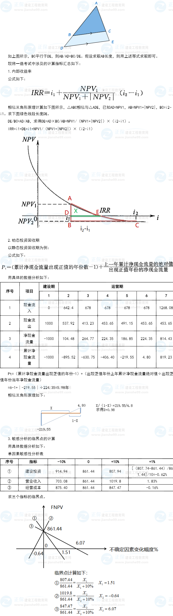 建設(shè)工程教育網(wǎng)2022年一級(jí)造價(jià)工程師專業(yè)老師為大家整理了一級(jí)造價(jià)師考試高頻考點(diǎn)“相似三角形原理在一造考試中的應(yīng)用”,在一造的學(xué)習(xí)中,我們會(huì)被大量的計(jì)算內(nèi)容所困擾,尤其是利用數(shù)學(xué)原理的計(jì)算。例如內(nèi)部收益率指標(biāo)的計(jì)算、靜態(tài)投資回收期和動(dòng)態(tài)投資回收期、敏感性分析中臨界點(diǎn)的計(jì)算等。遇到這類的問題,對(duì)于初學(xué)者來(lái)說(shuō)復(fù)雜的公式會(huì)讓我們知其然而不知其所以然。因?yàn)檫@些指標(biāo)的計(jì)算公式比較復(fù)雜,且不容易記憶。但是,掌握其中計(jì)算原理后,我們可以不死記公式也可以準(zhǔn)確的計(jì)算出來(lái)。