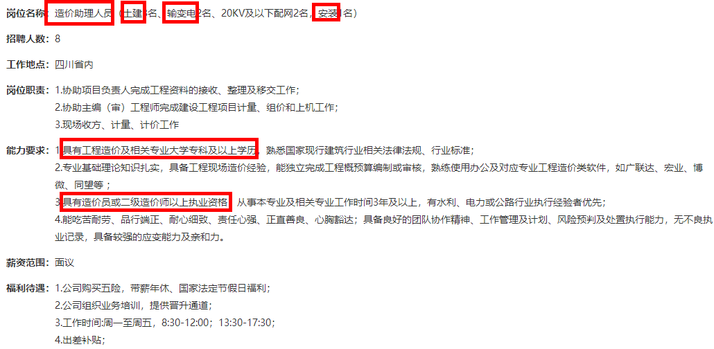 四川某大型公司企業(yè)招聘造價(jià)助理人員啦!來(lái)看看你符合要求嗎