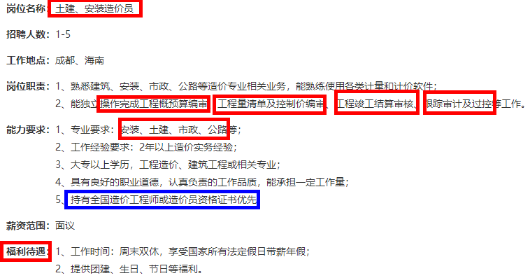 以下是某企業(yè)的招聘土建、安裝造價員的招聘簡章,后面也是明確說明了持有全國造價工程師或者造價員資格證書的人員優(yōu)先考慮,所以這個時候如果你有個一級造價工程師資格證書,那不就是很nice!