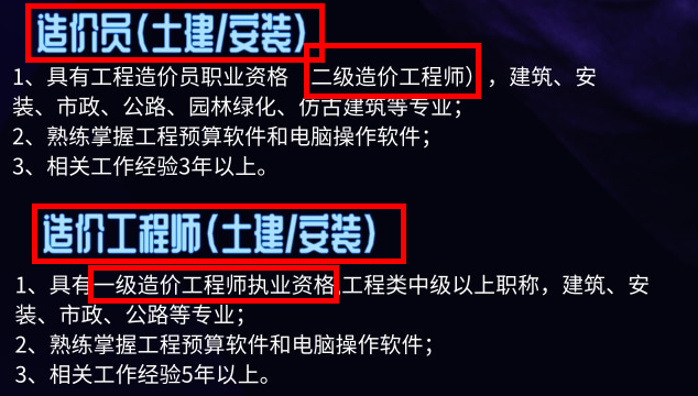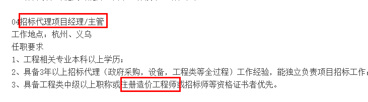 一份好的工作往往是有一定前提條件的,比如下面的這些企業(yè)招聘的崗位都需要具有一級造價工程師或者二級造價師等證書,所以想要找一份好的工作也是需要一定的能力的。