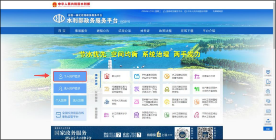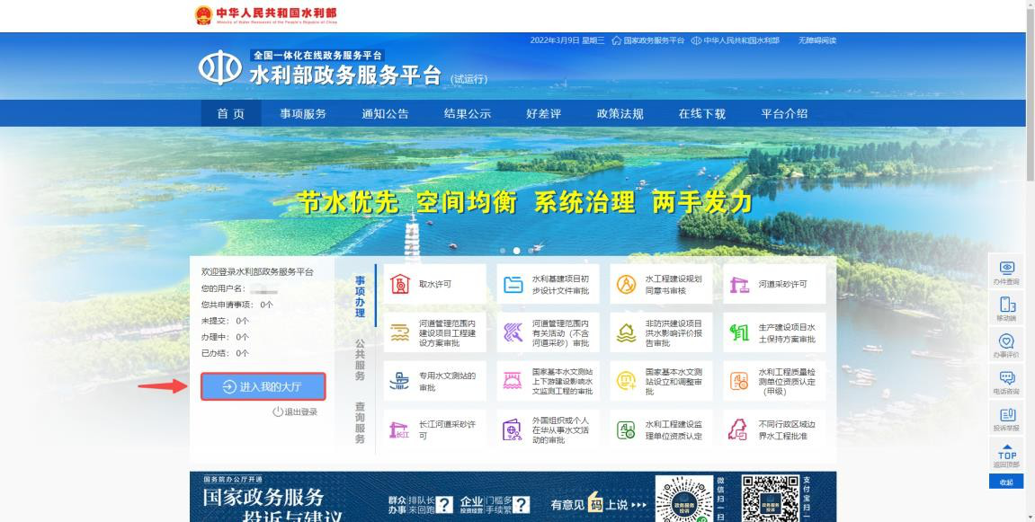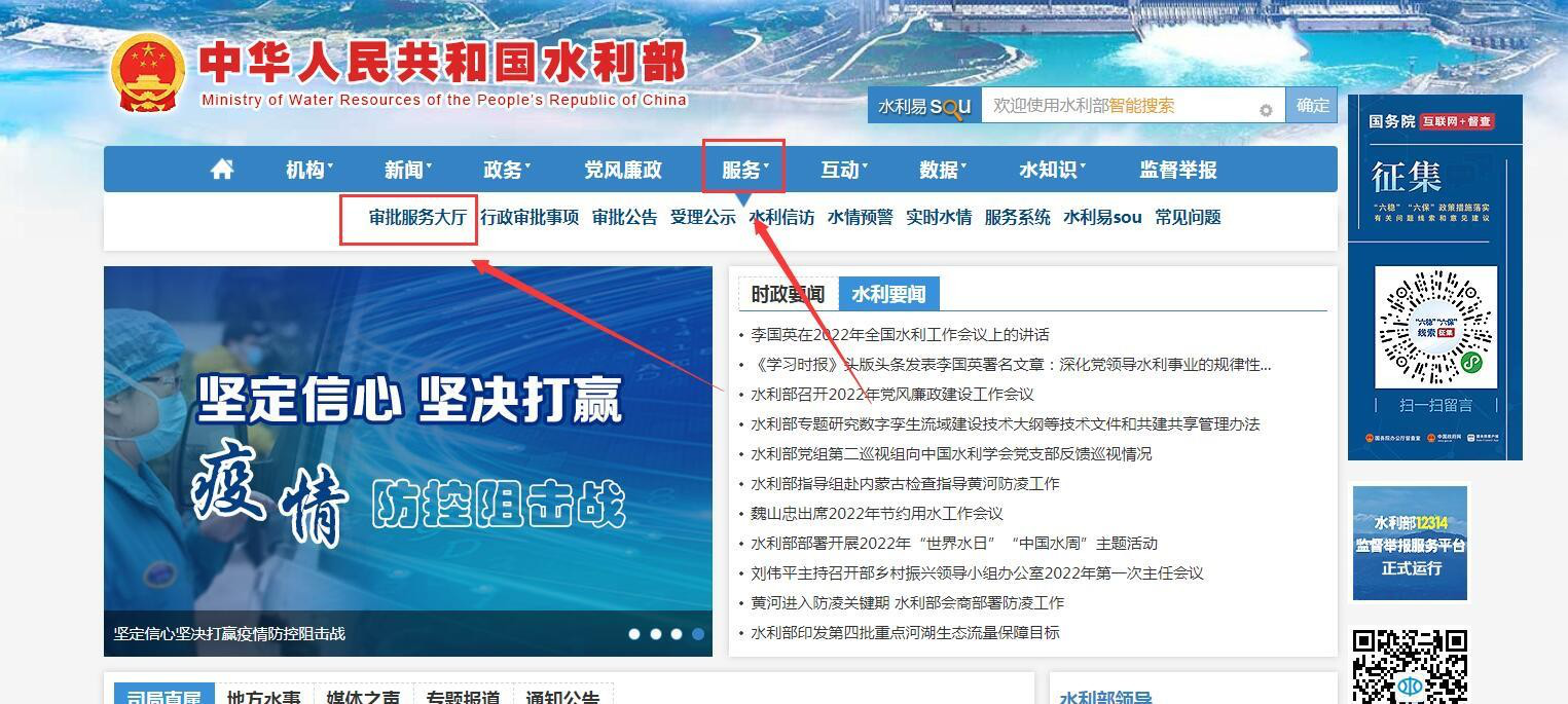 登錄水利部官方網站 ,選擇“服務”“審批服務大廳”,進入“水利部政務服務平臺”。