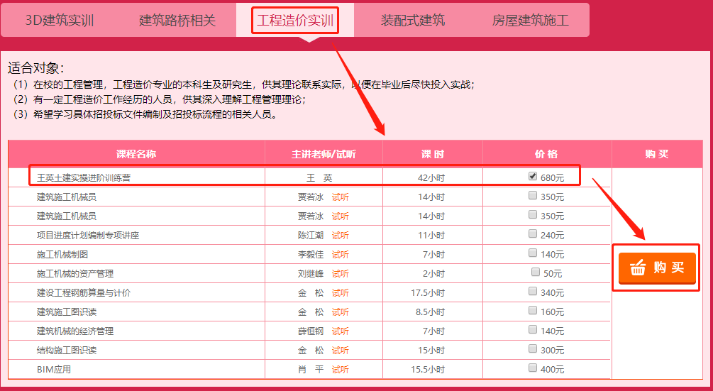 進(jìn)入建筑實(shí)務(wù)大講堂—點(diǎn)擊“工程造價實(shí)訓(xùn)”—選擇“王英土建實(shí)操進(jìn)階訓(xùn)練營”—購買