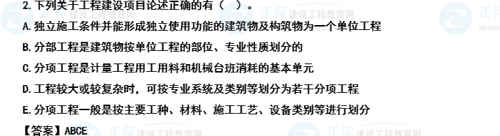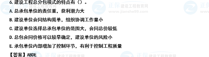 【考后點(diǎn)評(píng)】主要錯(cuò)誤原因漏選E。本題正確選項(xiàng)4個(gè),能選對(duì)3個(gè)選項(xiàng)就很不錯(cuò)了,漏選較多的是E選項(xiàng),涉及內(nèi)容是特點(diǎn)中的第三點(diǎn),有利于控制工程質(zhì)量部分的內(nèi)容,如果看書不仔細(xì),會(huì)忽略本段后面的解釋部分。