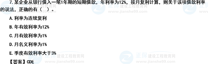 【考后點(diǎn)評(píng)】年利率12%,按月復(fù)利計(jì)算,那么一個(gè)計(jì)息周期的利率也就是月名義利率為1%,月有效利率為(1+1%)1-1=1%。