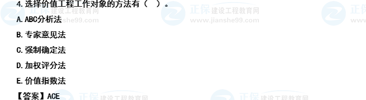 【解析】選擇價(jià)值工程工作對(duì)象的方法有:因素分析法、ABC分析法、強(qiáng)制確定法、百分比分析法、價(jià)值指數(shù)法。參見(jiàn)教材P205~206。