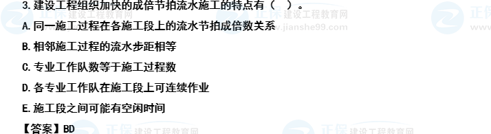 【考后點(diǎn)評(píng)】主要錯(cuò)誤選項(xiàng)A。選項(xiàng)A的錯(cuò)誤位置相當(dāng)隱蔽,對(duì)于成倍節(jié)拍流水施工,不同施工過(guò)程的流水節(jié)拍是倍數(shù)關(guān)系,但是同一施工過(guò)程的不同施工段是相等的。
