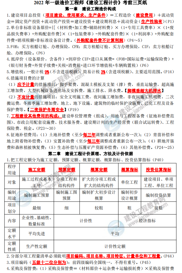 一級造價師考前三頁紙由建設(shè)工程教育網(wǎng)教研團隊精心整理,濃縮、提煉重要知識點,是考前必備學習資料!