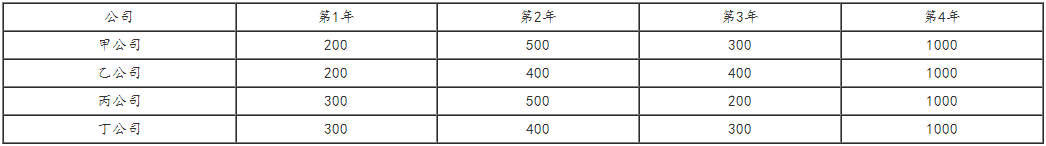 『2021·單選題』甲、乙、丙和丁四個(gè)公司投資相同項(xiàng)目,收益方案如下表(單位:萬元)。若社會(huì)平均收益率為10%,根據(jù)資金時(shí)間價(jià)值原理,其投資收益最大的是(?。?。