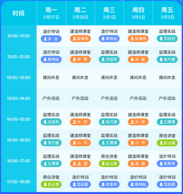 直播時(shí)間:每周一至周五,上午10:00-12:00,下午14:00-18:00,各輔導(dǎo)直播安排見下方課表