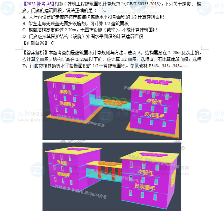 三、尤其是李毅佳老師的佳分動(dòng)畫(BIM實(shí)景)和網(wǎng)校老師的總結(jié)為建筑面積規(guī)范部分加分不少。下面我們就來看一道,考生普遍反映比較難得題目,通過佳分動(dòng)畫(BIM實(shí)景)和網(wǎng)校老師的總結(jié),是不是簡(jiǎn)單很多。