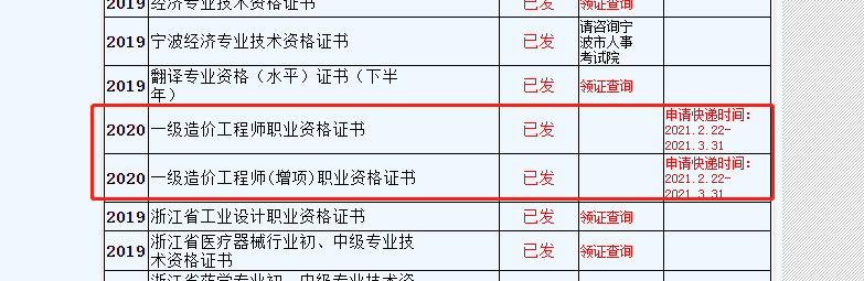從浙江人事考試網(wǎng)得知,2020年一級造價(jià)師(含增項(xiàng))證書可領(lǐng)取,申請快遞時間:2021.2.22-2021.3.31。