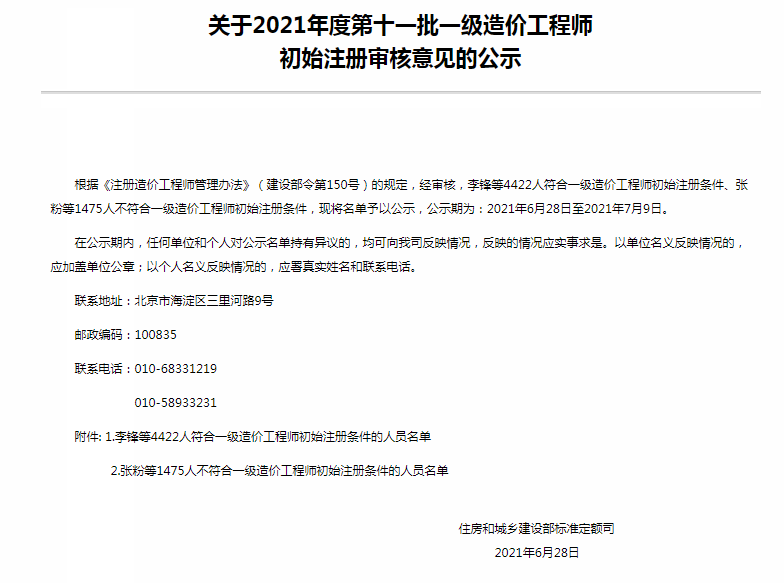 根據(jù)《注冊造價工程師管理辦法》(建設(shè)部令第150號)的規(guī)定,經(jīng)審核,李鋒等4422人符合一級造價工程師初始注冊條件、張粉等1475人不符合一級造價工程師初始注冊條件,現(xiàn)將名單予以公示,公示期為:2021年6月28日至2021年7月9日。