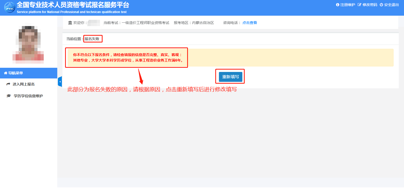 12.確定后,報名狀態(tài)即顯示出來,小編很幸運,報名失敗~因為年限不夠,報不上。黃色框內(nèi)顯示了報名失敗的原因,請考生根據(jù)報名失敗的原因進行重新填寫。