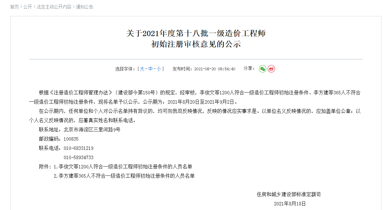 根據(jù)《注冊造價(jià)工程師管理辦法》(建設(shè)部令第150號(hào))的規(guī)定,經(jīng)審核,李俊文等1200人符合一級(jí)造價(jià)工程師初始注冊條件、李方建等365人不符合一級(jí)造價(jià)工程師初始注冊條件,現(xiàn)將名單予以公示,公示期為:2021年8月20日至2021年9月2日。
