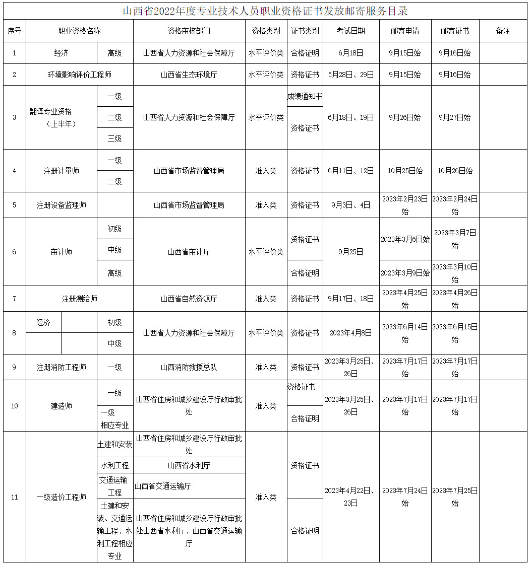 【郵寄目錄】山西省2022年度專業(yè)技術(shù)人員職業(yè)資格證書發(fā)放郵寄服務(wù)目錄