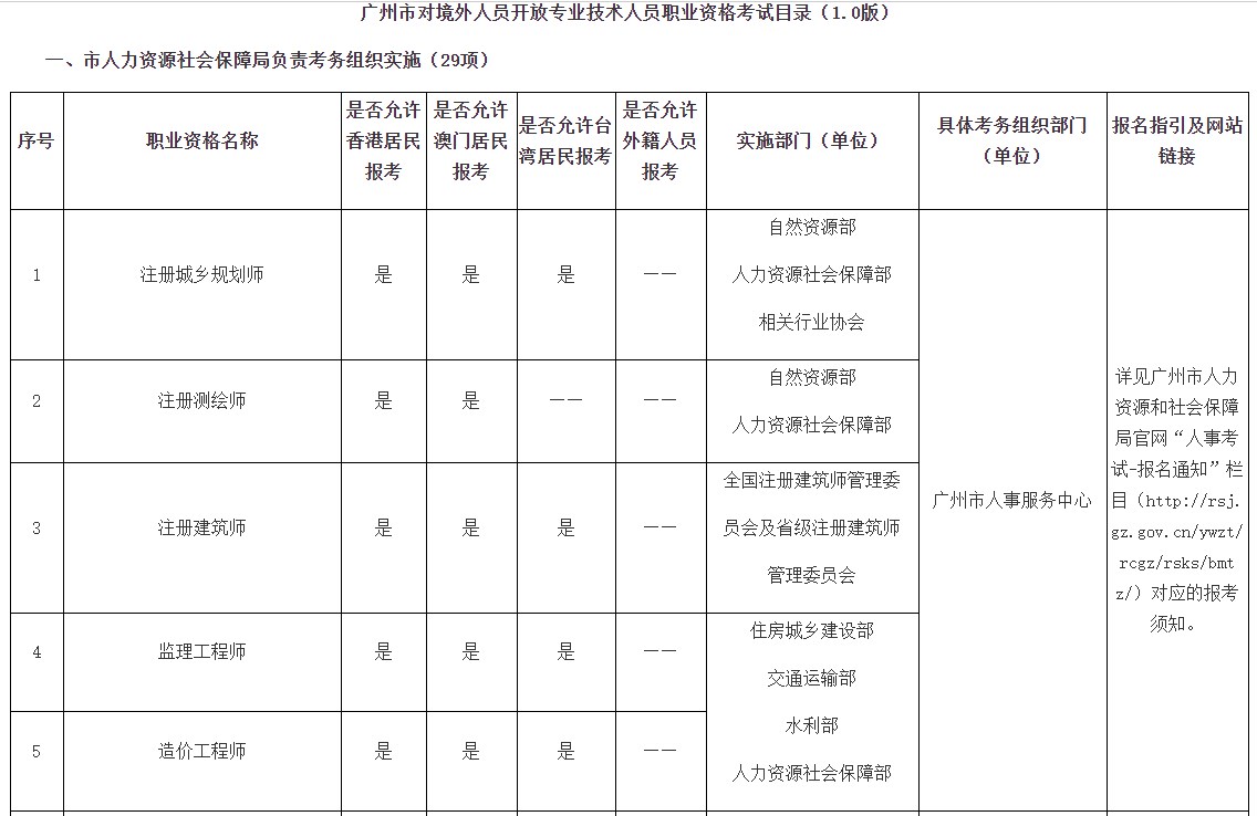 廣州市人力資源和社會保障局關(guān)于印發(fā)《廣州市對境外人員開放專業(yè)技術(shù)人員職業(yè)資格考試目錄(1.0版)》的通知