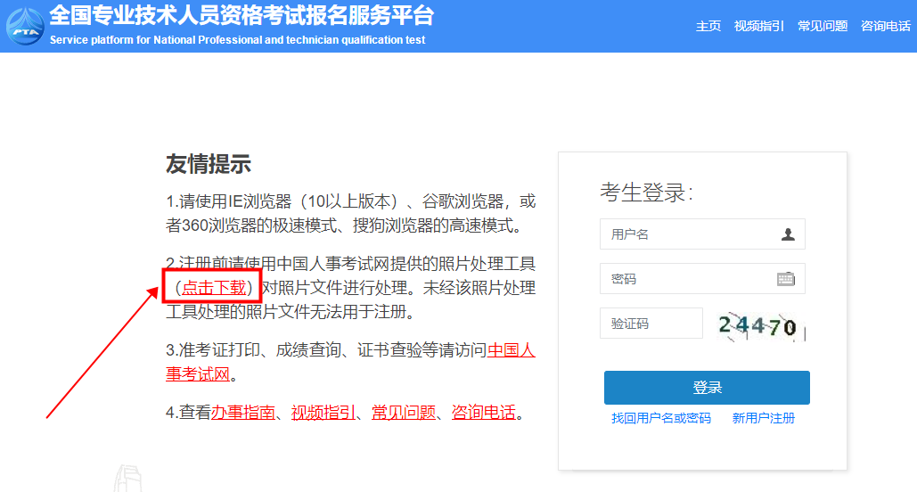 特別提醒:注冊(cè)前還需下載中國(guó)人事考試網(wǎng)提供的照片處理工具對(duì)照片文件進(jìn)行一下處理。未經(jīng)該照片處理工具處理的照片文件無(wú)法用于注冊(cè)。