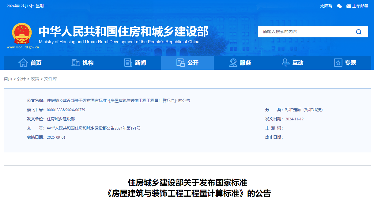 住房城鄉(xiāng)建設部關于發(fā)布國家標準《房屋建筑與裝飾工程工程量計算標準》的公告