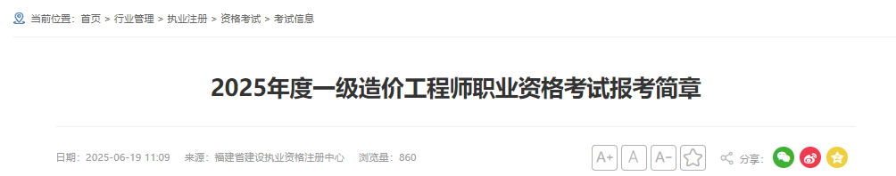 福建省2025年度一級造價工程師職業(yè)資格考試報考通知