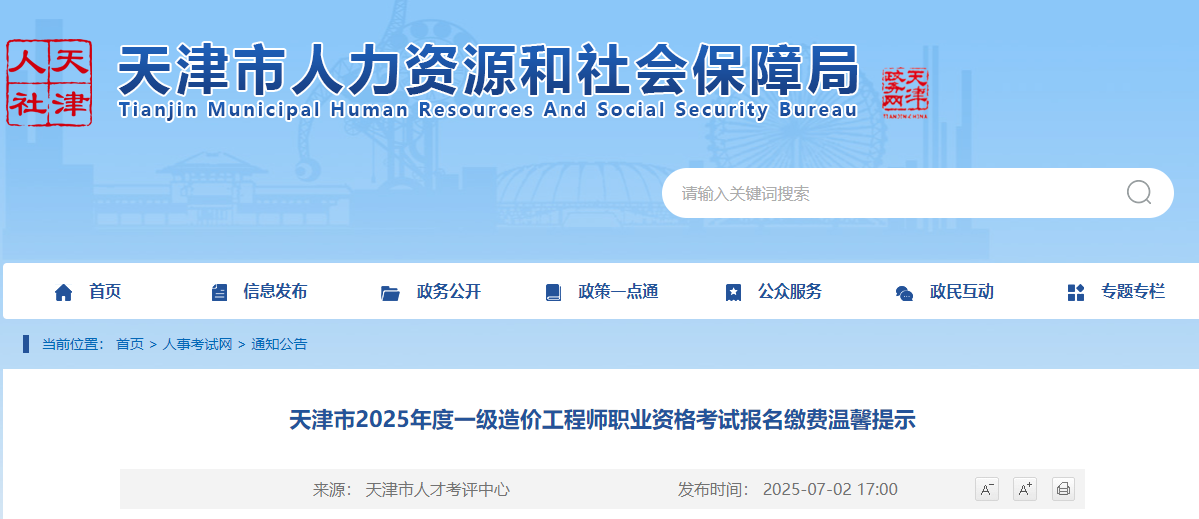 天津市2025年度一級(jí)造價(jià)工程師職業(yè)資格考試報(bào)名繳費(fèi)溫馨提示