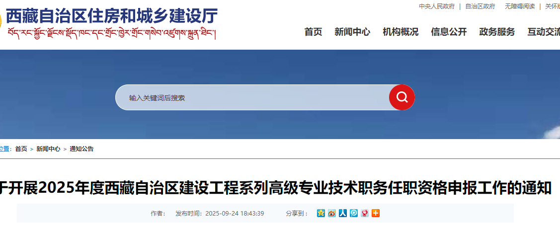 2025年度西藏自治區(qū)建設(shè)工程系列高級(jí)專(zhuān)業(yè)技術(shù)職務(wù)任職資格申報(bào)工作的通知已發(fā)布,申報(bào)截止時(shí)間2025年10月24日,逾期不予受理。詳細(xì)通知如下: