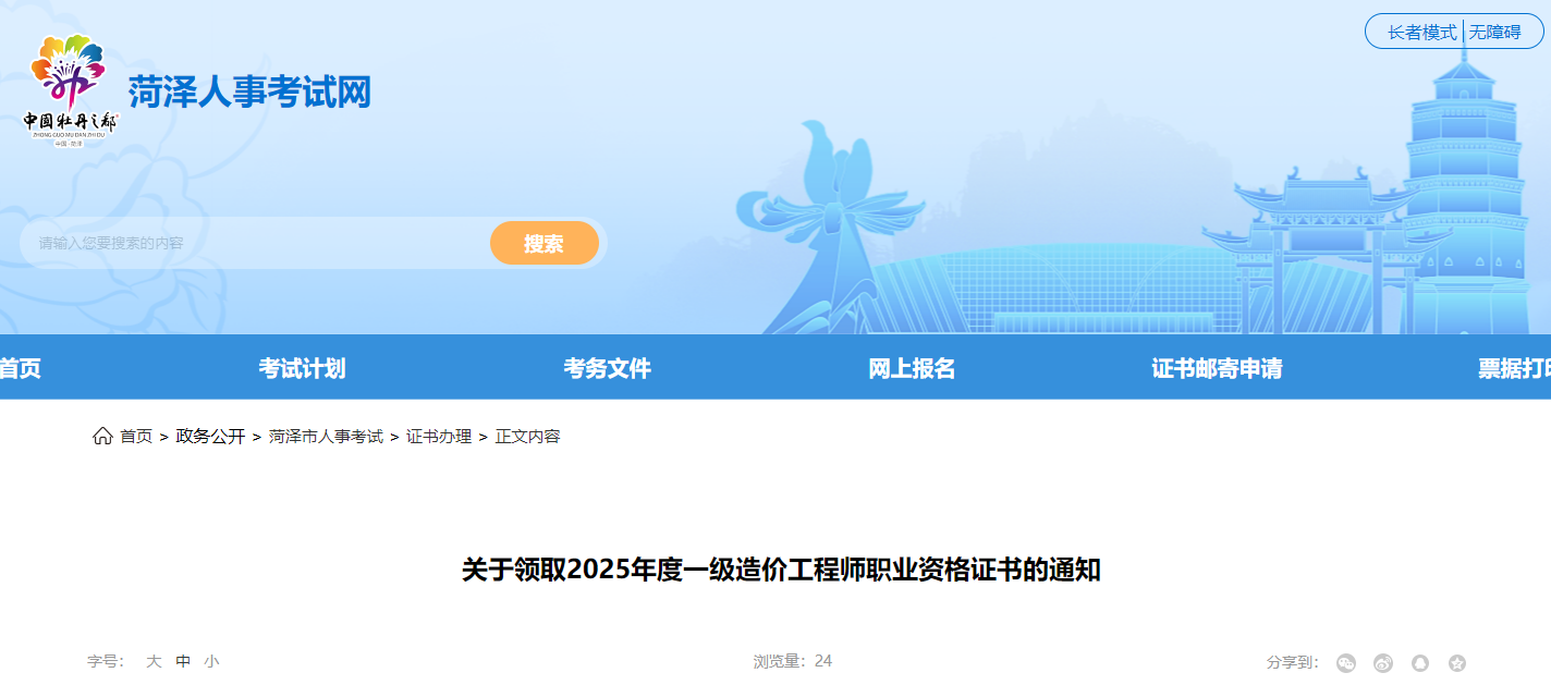 山東菏澤市2025年度一級造價工程師考試合格證書領(lǐng)取通知