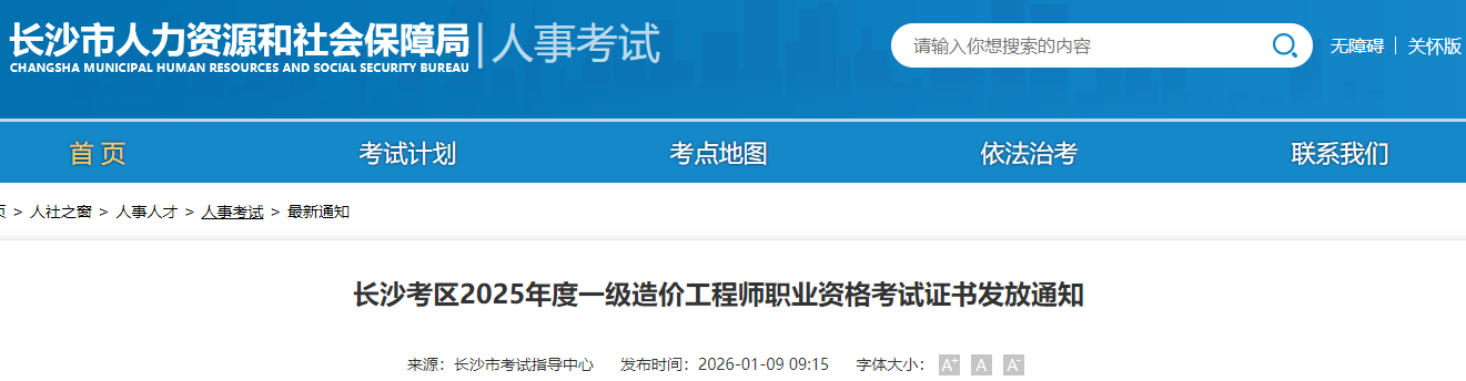 長沙考區(qū)2025年度一級造價工程師職業(yè)資格考試證書發(fā)放通知
