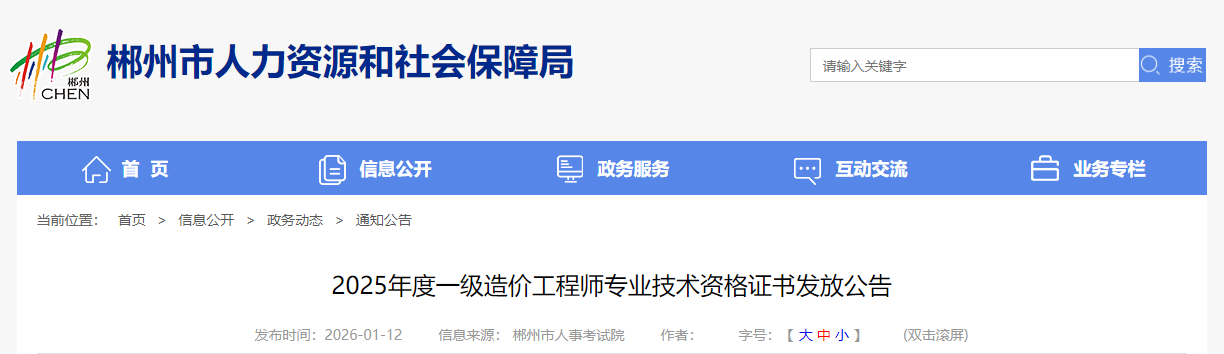 湖南郴州2025年度一級(jí)造價(jià)工程師專業(yè)技術(shù)資格證書發(fā)放公告
