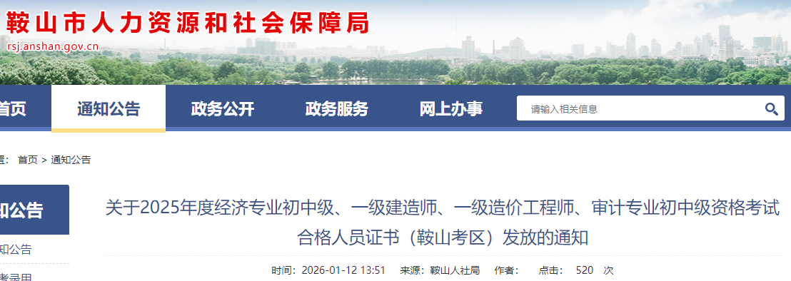 2025年度經(jīng)濟專業(yè)初中級、一級建造師、一級造價工程師、審計專業(yè)初中級資格考試合格人員證書(鞍山考區(qū))定于2026年1月13日開始發(fā)放,現(xiàn)將有關(guān)工作安排通知如下: