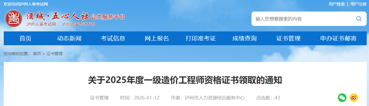 四川省瀘州市2025年度一級(jí)造價(jià)工程師資格證書(shū)領(lǐng)取通知