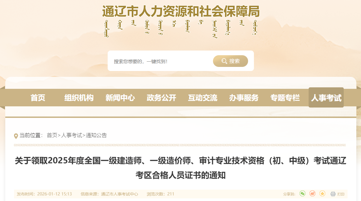 關(guān)于領(lǐng)取2025年度全國一級建造師、一級造價師、審計專業(yè)技術(shù)資格(初、中級)考試通遼考區(qū)合格人員證書的通知