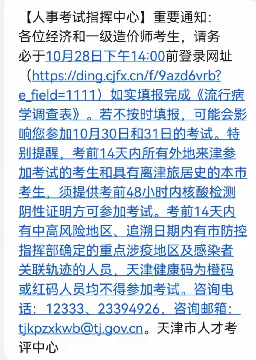 各位一級(jí)造價(jià)師考生,請(qǐng)務(wù)必于10月28日下午14:00前登錄網(wǎng)址(如實(shí)填報(bào)完成《流行病學(xué)調(diào)查表》。若不按時(shí)填報(bào),可能會(huì)影響您參加10月30日和31日的考試。特別提醒,考前14天內(nèi)所有外地來津參加考試的考生和具有離津旅居史的本市考生,須提供考前48小時(shí)內(nèi)核酸檢測(cè)陰性證明方可參加考試??记?4天內(nèi)有中高風(fēng)險(xiǎn)地區(qū)、追溯日期內(nèi)有市防控指揮部確定的重點(diǎn)涉疫地區(qū)及感染者關(guān)聯(lián)軌跡的人員,天津健康碼為橙碼或紅碼人員均不得參加考試。咨詢電話:12333、23394926,咨詢郵箱:。