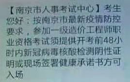 2021南京一級(jí)造價(jià)師考試即將來(lái)臨,面對(duì)再次席卷而來(lái)的疫情,各地都紛紛采取了相應(yīng)的疫情防控措施。那么南京市一級(jí)造價(jià)師考試有關(guān)疫情防控有什么新的政策和措施嗎?根據(jù)考生提供的短信截圖,我們獲取了南京市人事考試中心最新的疫情防控要求,內(nèi)容如下: