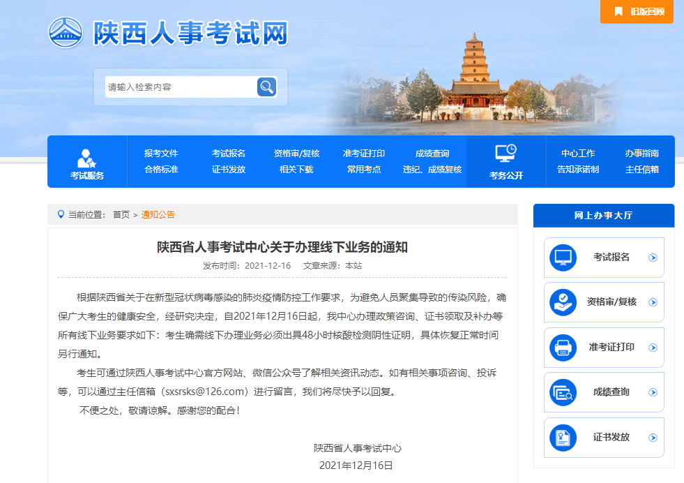 陜西省人事考試中心關于辦理線下業(yè)務的通知
