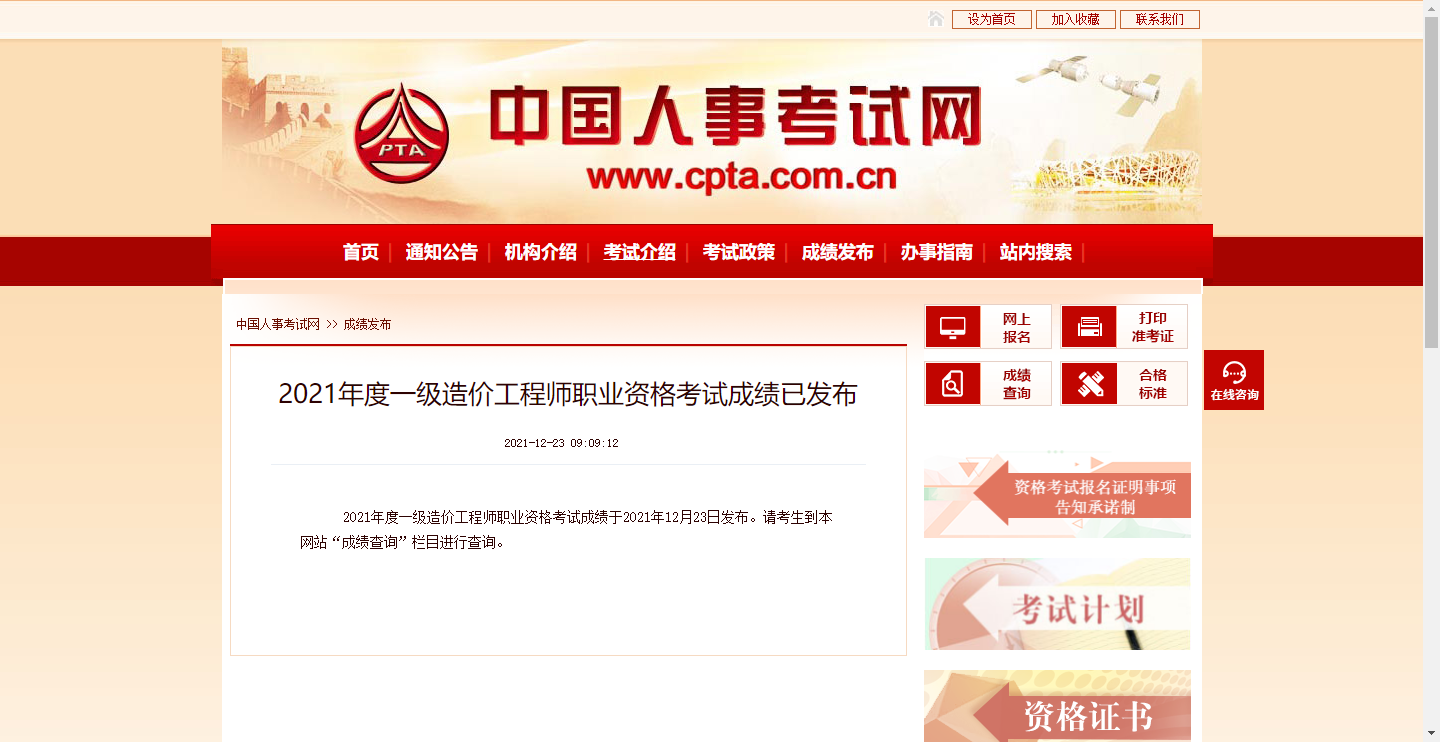 山東省2021年一級(jí)造價(jià)工程師考試查分入口在中國人事考試網(wǎng)開通了