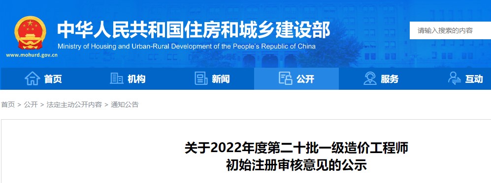 住建部關(guān)于2022年度第二十批一級造價工程師初始注冊審核意見的公示