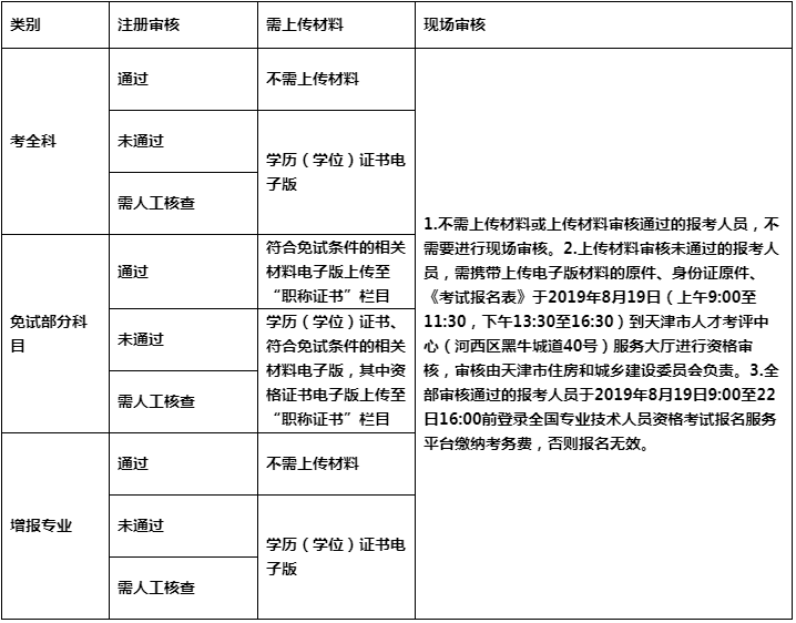 備注:(1)2019年8月6日9:00至8月15日16:00登錄全國專業(yè)技術(shù)人員資格考試報名服務(wù)平臺進行上傳相關(guān)資料電子版,審核部門將于2019年8月12日9:00開始對上傳材料進行審核。