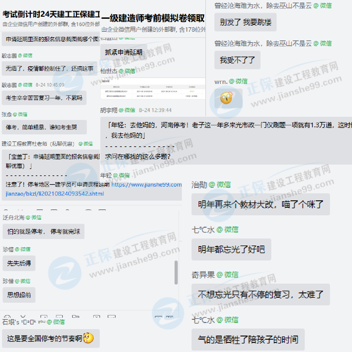 今日,江蘇、河南、陜西發(fā)布了2021年一級建造師??纪ㄖ?,考生們坐不住了,在群里紛紛議論起來,有的童鞋說:備考了這么久,這個時候說不考了,要跳樓的心都有了!有的學(xué)員說:光市政就做了1.3萬題目,現(xiàn)在說??剂耍∵€有的學(xué)員說:辛辛苦苦復(fù)習(xí)一年,誰知學(xué)員苦?……