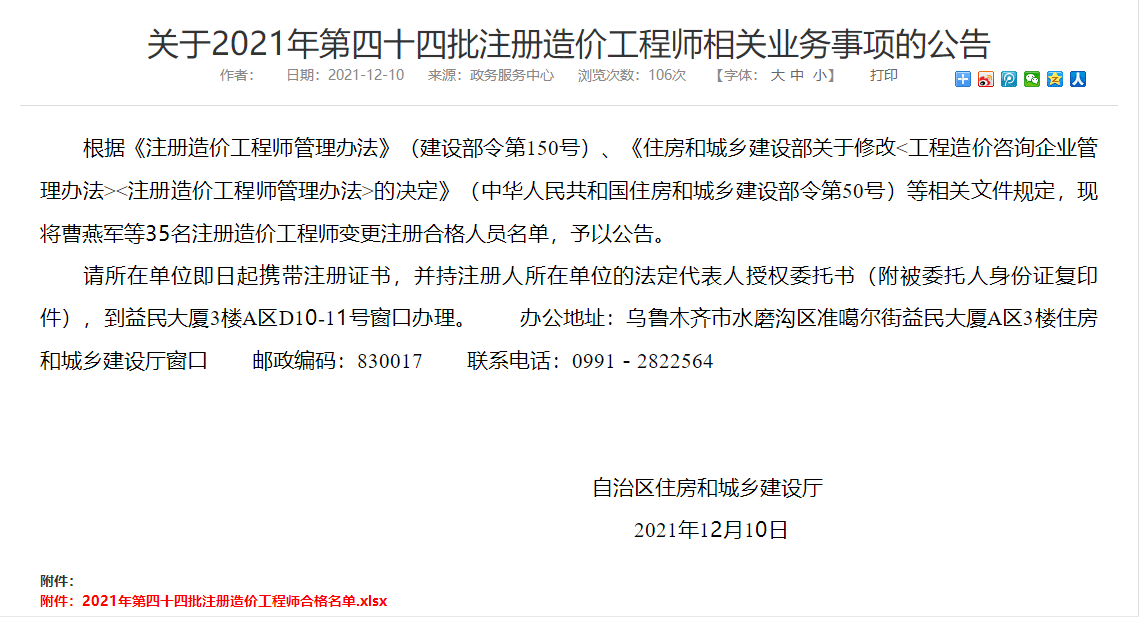 新疆關于2021年第四十四批注冊造價工程師相關業(yè)務事項的公告