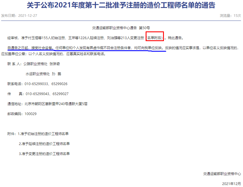 關(guān)于公布2021年第十二批準(zhǔn)予注冊(cè)的交通運(yùn)輸工程造價(jià)工程師名單的通告