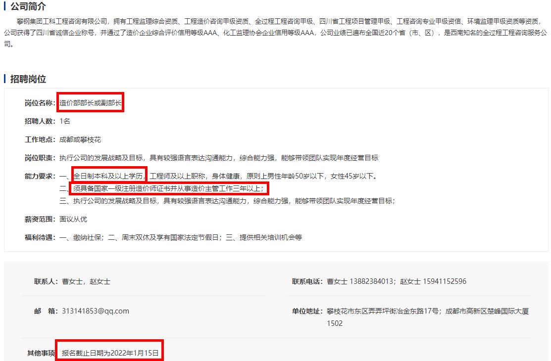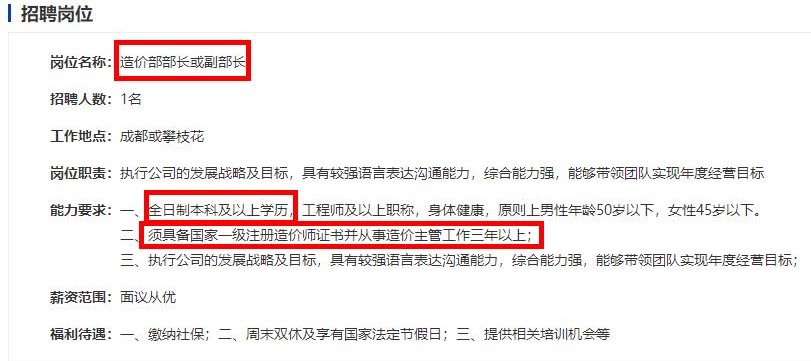 某大型公司招聘簡(jiǎn)章,需具有一級(jí)造價(jià)師證書