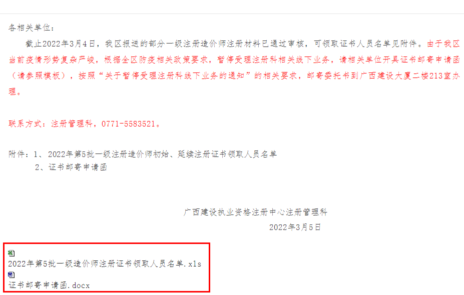 截止2022年3月4日,我區(qū)報(bào)送的部分一級(jí)注冊(cè)造價(jià)師注冊(cè)材料已通過(guò)審核,可領(lǐng)取證書(shū)人員名單見(jiàn)附件。由于我區(qū)當(dāng)前疫情形勢(shì)復(fù)雜嚴(yán)峻,根據(jù)全區(qū)防疫相關(guān)政策要求,暫停受理注冊(cè)科相關(guān)線下業(yè)務(wù),請(qǐng)相關(guān)單位開(kāi)具證書(shū)郵寄申請(qǐng)函(請(qǐng)參照模板),按照“關(guān)于暫停受理注冊(cè)科線下業(yè)務(wù)的通知”的相關(guān)要求,郵寄委托書(shū)到廣西建設(shè)大廈二樓213室辦理。