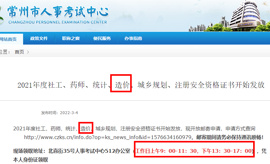 江蘇常州2021年一級造價工程師證書開始發(fā)放