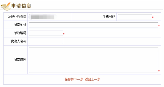第七步:在點擊同意“考生郵寄服務承諾書”后,填寫郵寄信息,包括手機號碼、郵寄地址、郵政編碼、收件人等,然后點擊“保存并下一步”。