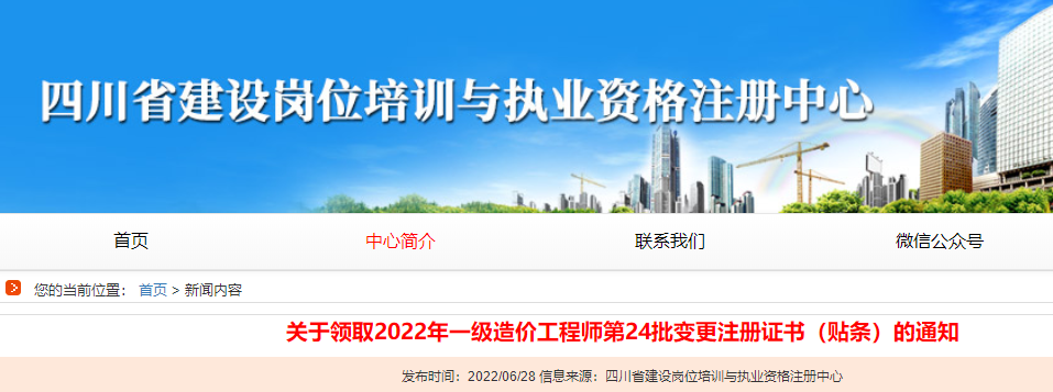 四川領(lǐng)取2022年一級造價工程師第24批變更注冊證書(貼條)的通知