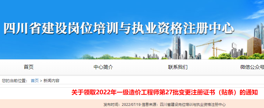 四川領(lǐng)取2022年一級(jí)造價(jià)工程師第27批變更注冊(cè)證書(shū)(貼條)的通知
