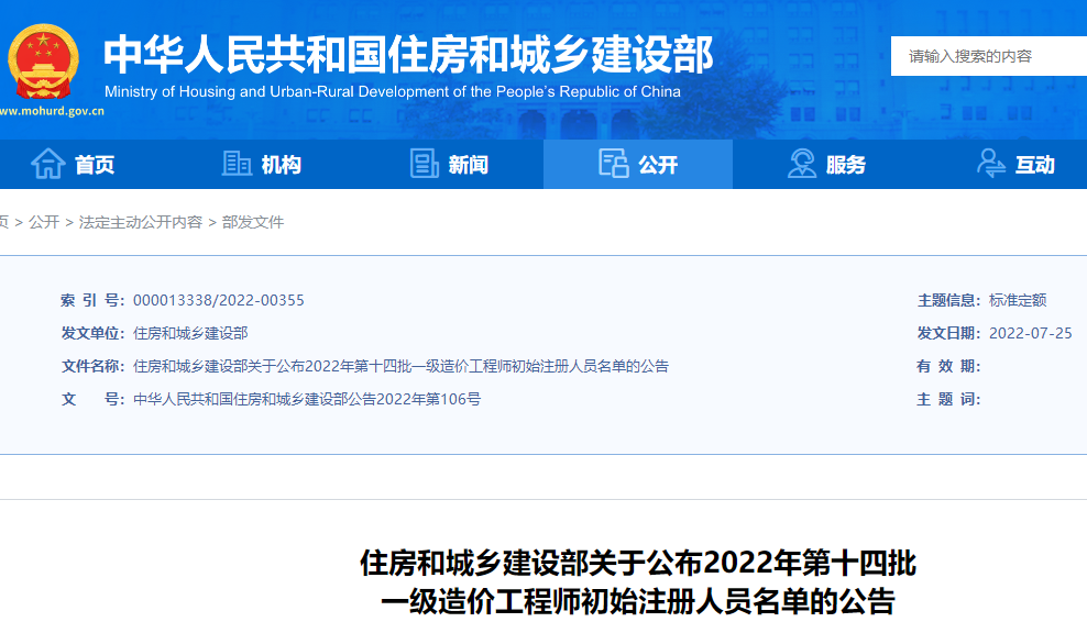 住建廳公布2022年第十四批 一級造價(jià)工程師初始注冊人員名單的公告