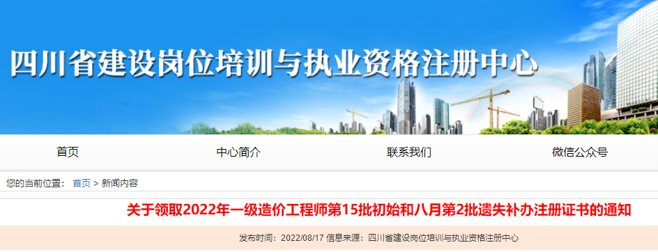 四川領取2022年一級造價師第15批初始和八月第2批遺失補辦注冊證書的通知