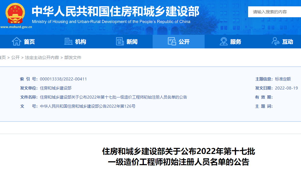 住建部公布2022年第十七批 一級造價工程師初始注冊人員名單的公告