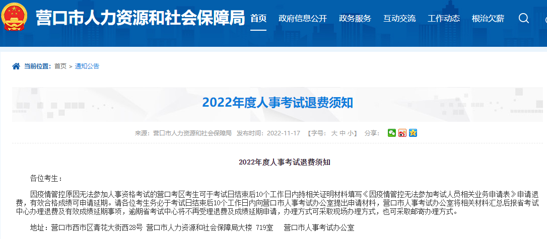因疫情管控原因無法參加人事資格考試的營口考區(qū)考生可于考試日結(jié)束后10個工作日內(nèi)持相關(guān)證明材料填寫《因疫情管控?zé)o法參加考試人員相關(guān)業(yè)務(wù)申請表》申請退費(fèi),有效合格成績可申請延期。請各位考生務(wù)必于考試日結(jié)束后10個工作日內(nèi)向營口市人事考試辦公室提出申請材料,營口市人事考試辦公室將相關(guān)材料匯總后報(bào)省考試中心辦理退費(fèi)及有效成績延期事項(xiàng),逾期省考試中心將不再受理退費(fèi)及成績延期申請,辦理方式可采取現(xiàn)場辦理方式,也可采取郵寄辦理方式。